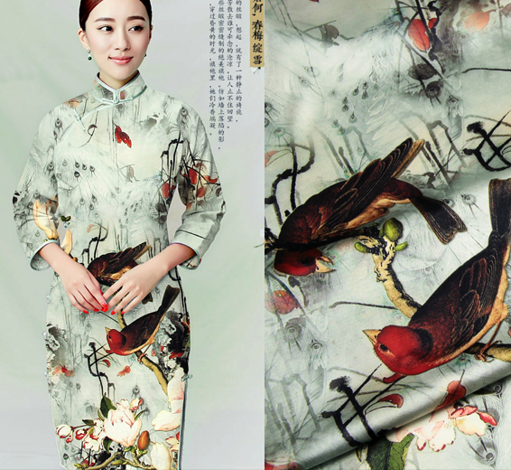 中国风新品重磅数码喷绘真丝桑蚕丝弹力缎服装 画眉娇连衣裙