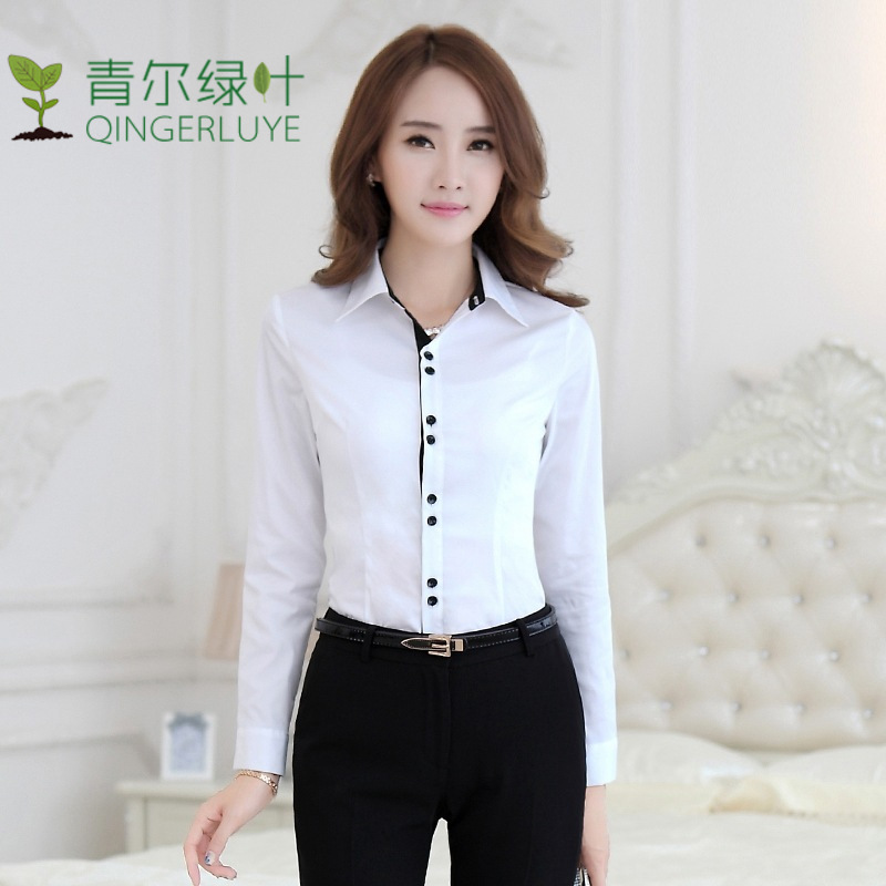 时尚工装春秋职业装女修身长袖纯色衬衣女衬衫百搭上衣